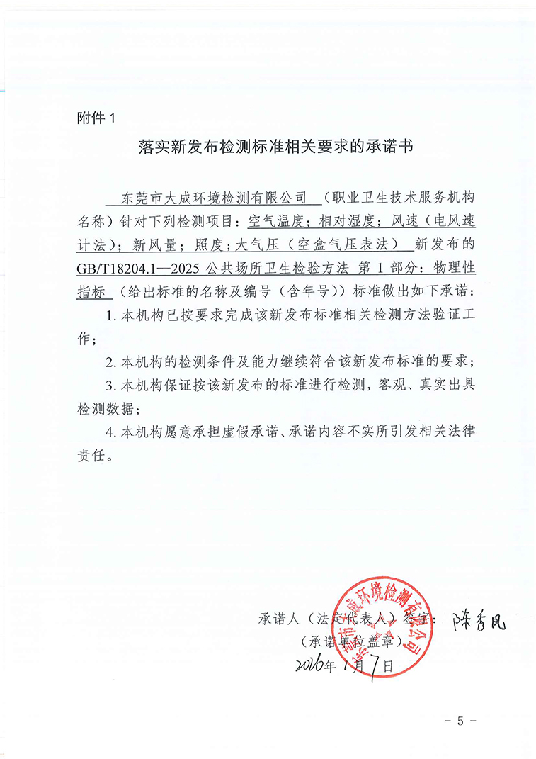 落实新发布检测标准相关要求的承诺书