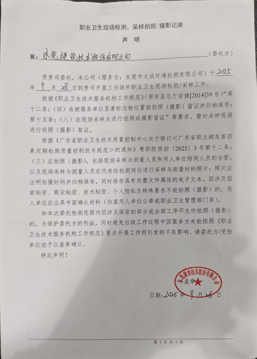 | 报告名称 | 东莞捷荣技术股份有限公司职业病危害定期检测报告书 | |||||